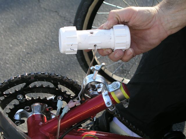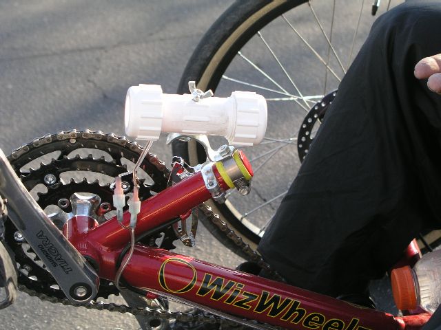 Here is a file containing three pictures showing how I mounted the Seth Jayson BS headlight to the WW 3.4. The fourth picture shows how I managed to get the magnetic sensor for my el cheepo nashbar computer close enough to the wheel-mounted-magnet to have it work. I couldn't find my spare elastic cord to tie down the battery, so the battery is currently held in place with miscellaneous cotton fiber cord and a loop of old bike tube. I did glue some gambling table felt (not visible in pictures) to the bottom of the batteries to keep from scratching the paint. That may be a little harder to come by outside of Sin City. The readout sits on the left side of the handlebar, easily visible while riding. I did have to lengthen the cord by adding a section of wire taken from an old set of Christmas lights. Christmas light wire is tough and just the right current carrying capacity to add to the existing cord. I would recommend soldering the connections and using shrink tubing to insulate the connections. The splice is under the frame so the green color of the Christmas light wire is not noticeable to observers. The sensor mount is a length of 1" diameter, schedule 40 irrigation pipe with a notch cut in one end. I made the notch oblong using a round file. I wrapped the WW frame member with a protective cover of red 3M vinyl tape to make the pipe fit snugly over the frame but still not scratch it. The pipe is held in place laterally with a small piece of elastic cord wrapped around the frame from the side. The fine spacing between the frame and the plastic pipe is accomplished by using one or more cork circles used to cushion cabinet doors as the doors are closed against the cabinet frame. I cut four holes in the side of the pipe facing the spokes to attach the sensor to the pipe with cable ties. The sensor has stayed in place and has worked perfectly for over 1000 miles so I guess it must be a suitable attachment. Don't want to make you feel bad, but yesterday was so nice I was able to ride in a T-shirt. Pretty unusual for January, even here. You can make me feel bad in turn by commenting on how nice it is in Michigan in July when it is 120 in the shade here! The odometer passed the 1000 mile reading during the ride.