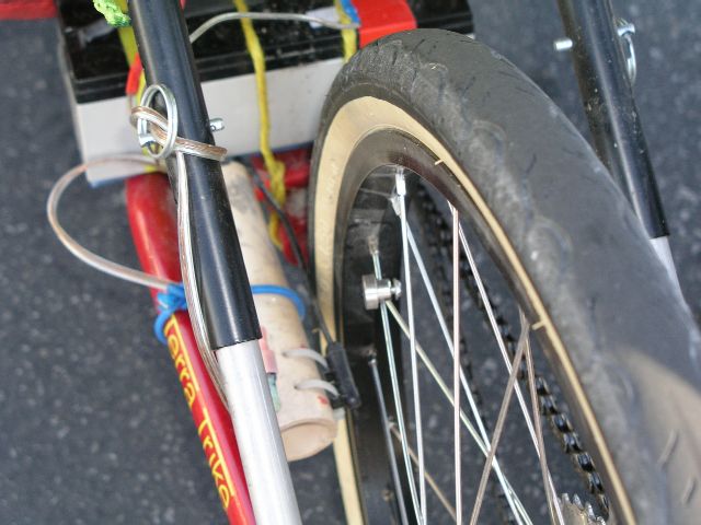 I thought you might like a follow-up on how well Seth Jayson's 20 Watt homemade bike light system worked for me on the WW 3.4. I have the light mounted on the derraileur post and the battery on the platform formed by the frame behind the seat. It works great and the total cost was about 25 dollars and an hour or two for construction time. You can go to Seth's website by going back to 11/24/03 in general discussion on bentrideronline and clicking on "Make yer own light" Print out a copy of his instructions as I think this will disappear from the listings before long. The only modification I had to make to Seth's plans was to first mount the lamp holder on a 1" metal C clamp intended for attaching electrical conduit to a wall instead of mounting the holder directly to the hose clamp on the frame. I used the variety that has only one screw hole instead of two as in a U-clamp. The really lightweight versions used for securing water pipes to house frames are too easy to bend (I tried that kind first). I used Seth's mounting system to mount the C clamp to the frame - this consists of a hose clamp with a hole drilled in it for the mounting bolt - in my case the bolt was just long enough to mount the C clamp to the hose clamp. I drilled a hole in the C clamp at the point necessary to keep the lamp holder horizontal. If you don't get it just right, it is possible to bend the C clamp a little to change the vertical position of the beam. Just be sure to take the C clamp off the frame first before trying to bend it. The batteries are in parallel and are bound together and tied to the frame using some 1/4" elastic (bungy) cord until I figure out if I need a more secure mounting. So far I have ridden about 30 miles without having any problem. The light looks unusual but good, not as though it were thrown together from a bunch of parts. It sure makes the trike visible from a distance! The parts I used and the approximate cost of each PVC compression fitting from Home Depot $2.49 Lamp from Home Depot - 20W halogen $5.99 Two 12 volt 2.3 Ah Sealed lead acid batteries $6.00 ea + shipping (American Science and Surplus website) 25 feet of speaker wire - 99cent Only Store $1.07 (used about 1/3) Hose clamp (had in my used part bin) C-clamp for electrical conduit Home Depot $ 1.29 (pkg of 4) 6 each Female disconnects - 18 ga wire $.89 6 each Male disconnects - 18 ga wire $.89 toggle bolt 1/4" by 1/2" Home depot $.08 toggle bolt 1/4" by 1 1/2" Home Depot $.12 1/4 " nut and 1/4" wingnut (used part box) Second hand 12 volt 300 ma plug in power source $2.00 I found an old AT$T unit for one of their cordless phones. I just searched the secondhand stores until I found one that delivered 12 volts DC and 200 to 300 ma current. You might need a volt meter to check the polarity of the wires before hooking the battery to the charger. You can also use a 12 V car battery charger but the output of a conventional charger is very high compared to the amount you need for charging and it is a waste of electricity. It is also a pain to work with the big wires coming out of the regular charger. The batteries I used were intended for an emergency lighting source so they have a built in charge limiter and can only be completely charged overnight. I expect the battery to discharge in about 2.5 to 3 hours used with the 20W bulb. You could switch to a 10W bulb and get twice the (time.)