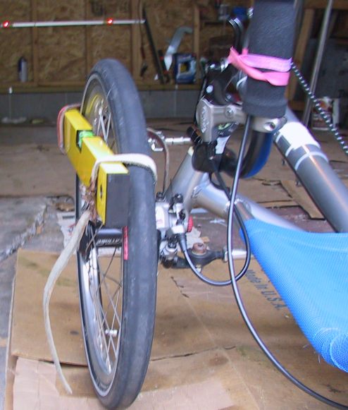 I got two laser levels cheap by mail order. Before you use them, you can tie them together, measure the distance between the beams near the levels and then far away to see if there is any skewness you need to deal with. I tied them onto the sides of the wheels at the same height front and back, both sides. I used old toe straps. The first experiment I did is I wanted to see if the rider's weight affects the toe-in. So I marked where the two beams hit the far wall before I sat down. Then I sat down to see if the distance between the two laser dots changed. For me, the dots moved closer so I know I want to be seated when I do the measurement. Maybe for someone heavier it matters more.